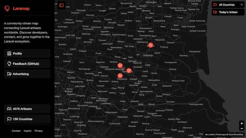 Laramap adalah peta komunitas global untuk developer Laravel. Kamu bisa membuat profil, terhubung dengan developer lain, hingga melihat bagaimana komunitas ini tumbuh di berbagai belahan dunia.