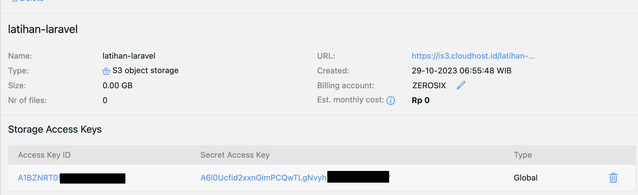 Seterah berhasil klik nama buket pada kolom sebelah kiri, maka akan di arahkan ke halaman yang menampilkan Access Key ID, Secret Access Key, URL dan Name (nama bucket).